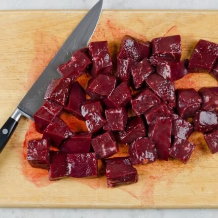 Raw liver сut into pieces on a cutting board