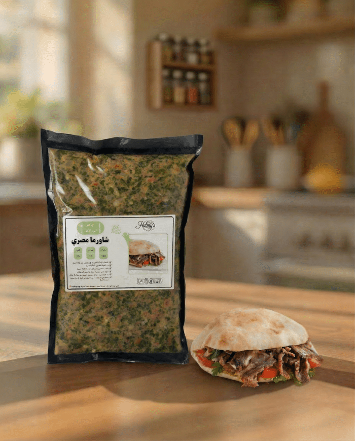 شاورما مصري جاهزة للأكل مشوية بلحم بلدى مع الطماطم والبصل، ومُضاف إليها بقدونس و طحينة وزن صافي 1000 جرام محفوظة داخل كيس فاكيوم